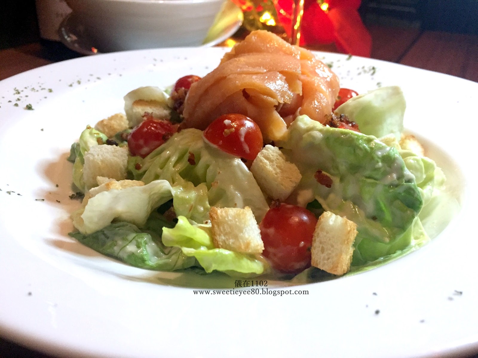 一道凱薩沙拉,添加具有畫龍點睛之效的煙熏三文魚後不止提鮮,亦為樸實的健康沙拉增添了一絲奢華感。